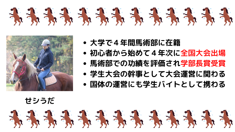 ここで、だいぶ図々しいんですが、管理人の馬術部に関するプロフィールを紹介させてください、、、